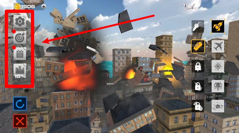 3.左侧为主控选单区,包含设置、目标进度、任务记录与城市破坏进度百分比,便于随时查看进展。