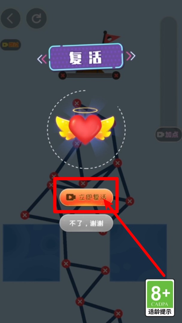 1.立即复活机制:挑战失败时可选择观看广告视频进行复活,不仅无需重来,还能保留当前结构状态继续闯关。