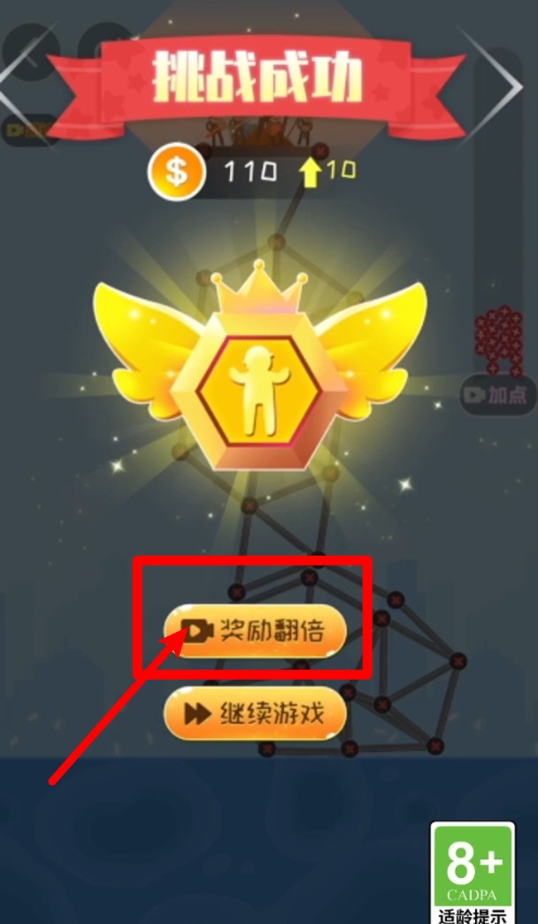 2.成功后奖励翻倍:每次通关后可选择点击奖励翻倍按钮,通过观看视频获取额外金币,加速养成与进度推进。