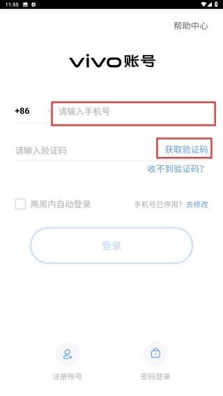 1、打开登录界面,输入您的【手机号】,接着点击【获取验证码】。