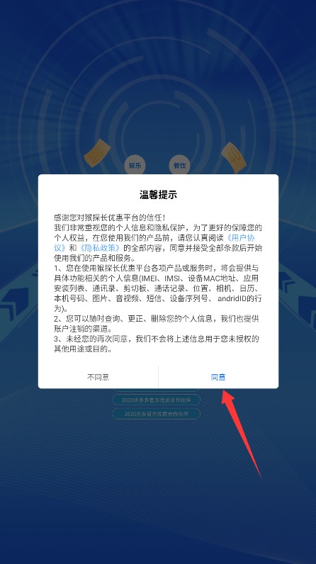 1、初次使用需完整阅读平台服务条款与隐私政策,确认后点击同意按钮进入应用。