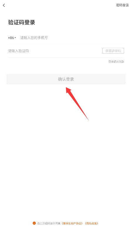 2、输入手机号码,获取并输入短信验证码,勾选同意协议后点击确认登录即可。