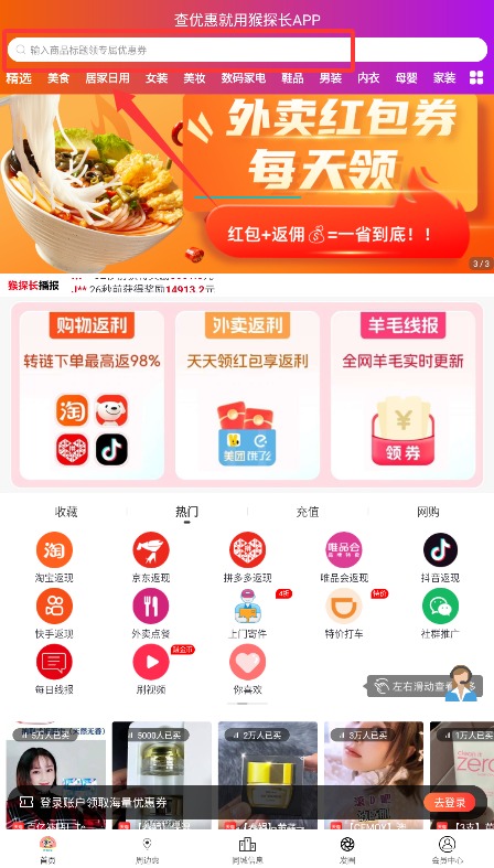 3、进入首页后,可在顶部搜索栏输入商品名称领取专属折扣券享受购物优惠。