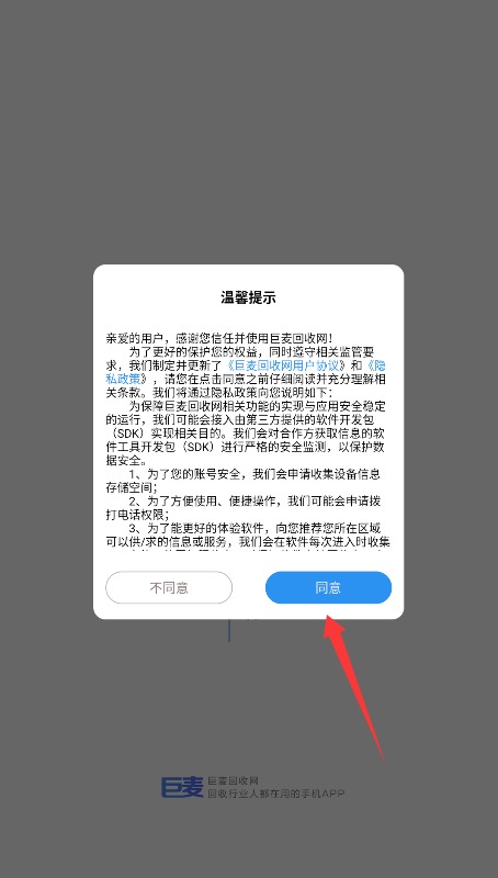 1、初次使用需完整阅读平台服务条款与隐私政策,确认后点击同意按钮进入应用。