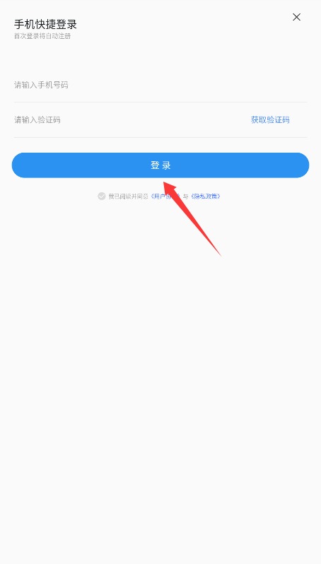 3、输入手机号获取短信验证码,勾选同意用户协议后点击"登录"完成账号验证。