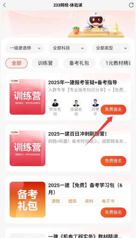3、从展示的课程列表中选取需要学习的科目,直接点击免费报名按钮完成课程注册。