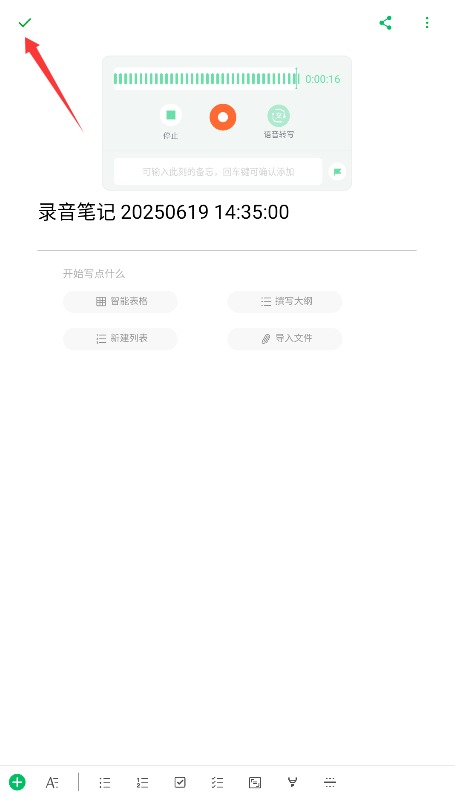 3、录制结束后可为音频添加标题备注,支持插入智能表格或附件,最后点击保存完成归档。