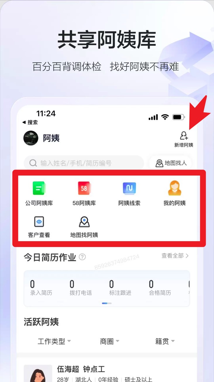 2. 进入“共享阿姨库”页,可查看58阿姨库、公司库、线索、地图找阿姨等功能,支持通过名字、手机、简历编号等条件搜索。