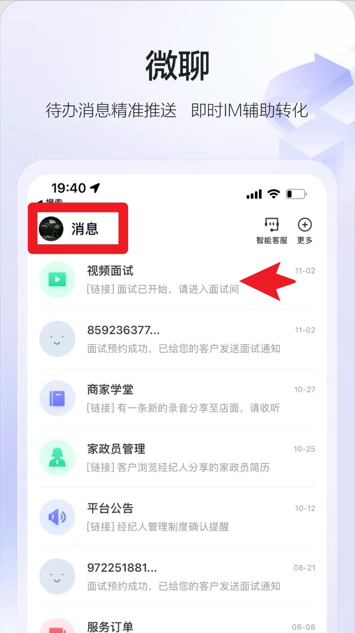 接收平台线索下发,阿姨动态等消息推送;提供高效建联渠道,通过即时IM辅助客户转化。
