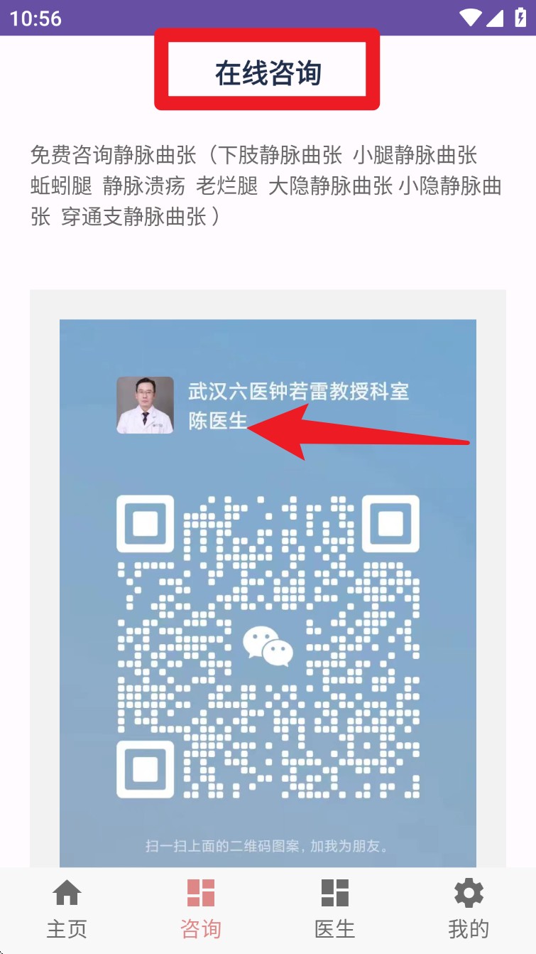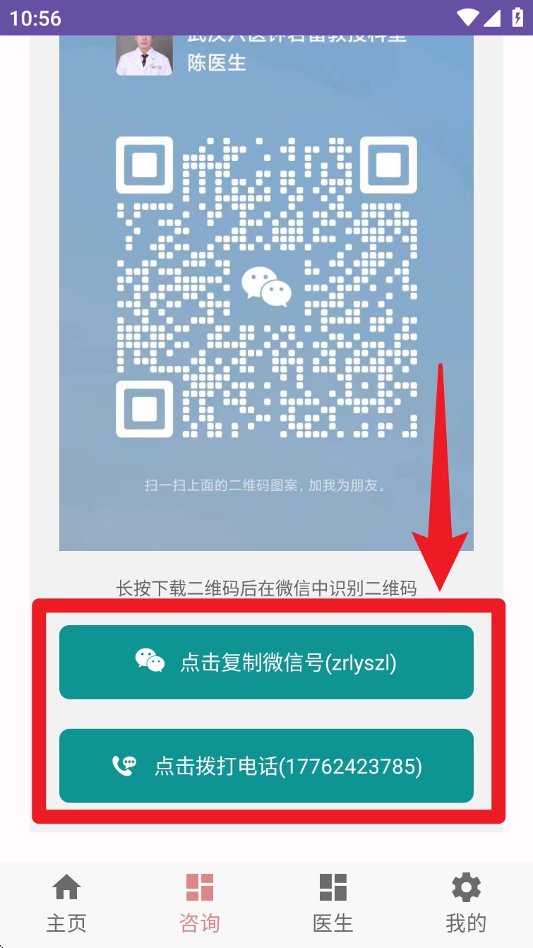 2. 进入“咨询”页面,可添加医生微信或拨打电话,获取一对一的在线问诊服务。