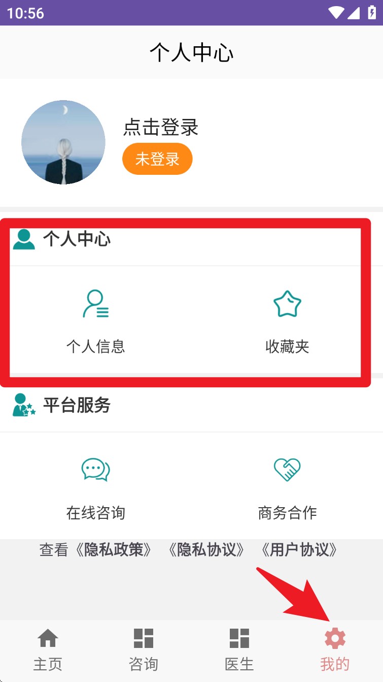 5. 在“我的”页面可查看个人资料、历史收藏等内容,也能进入平台服务了解隐私政策等。