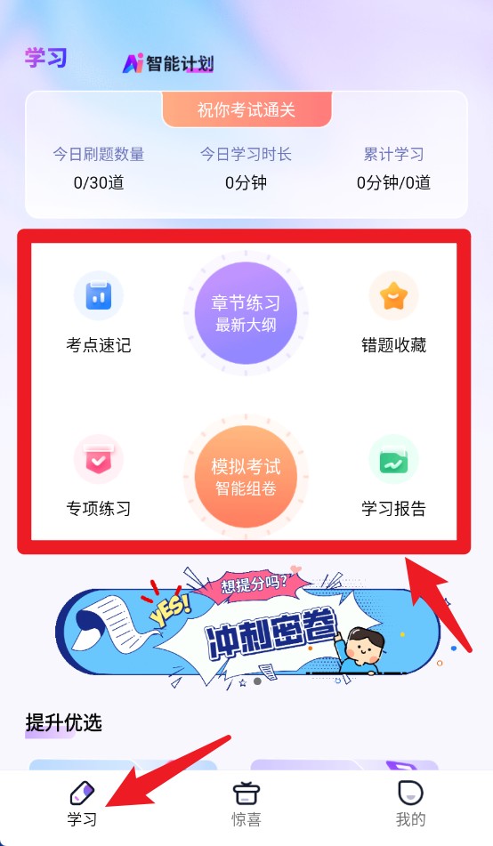 1、点击“学习”进入主界面,可选择章节练习、错题收藏、模拟考试等多种学习模块。