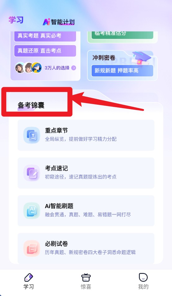 2、点击“备考锦囊”查看重点章节、考点速记和必刷试卷,高效规划复习内容。