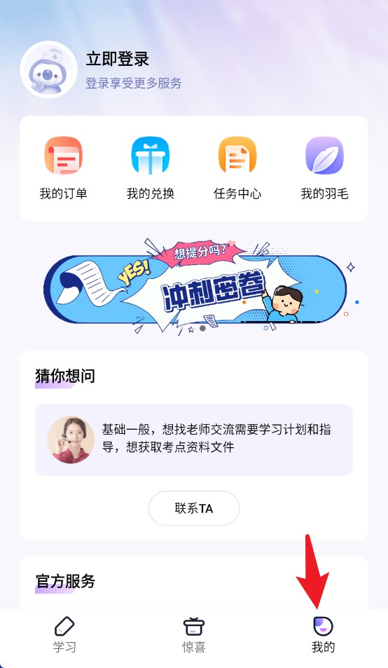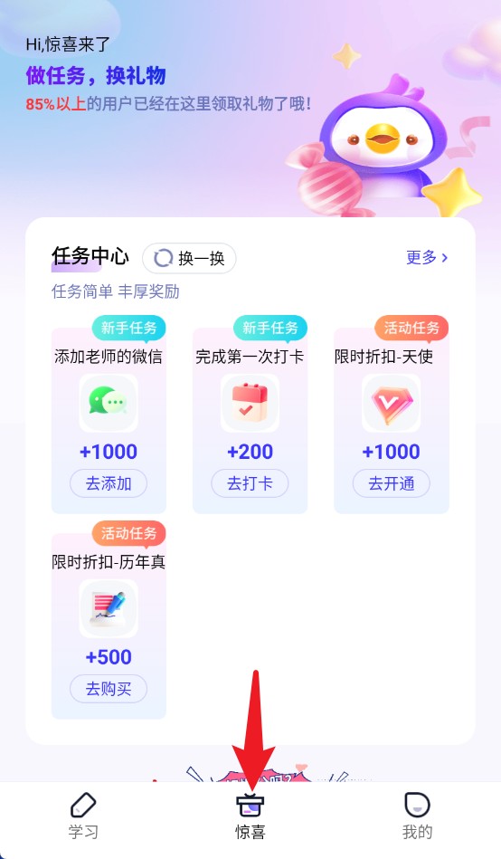 3、进入“惊喜”页面完成简单任务即可领取积分奖励,用于兑换更多学习资源。