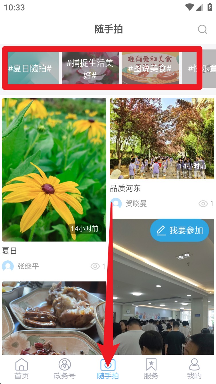 3. 切换至“随手拍”模块,拍摄上传身边美景、美食等,分享你眼中的美好生活瞬间。