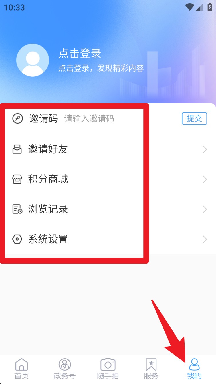 5. 在“我的”页面可查看浏览记录、进入积分商城兑换商品,还可管理登录信息与个性设置。