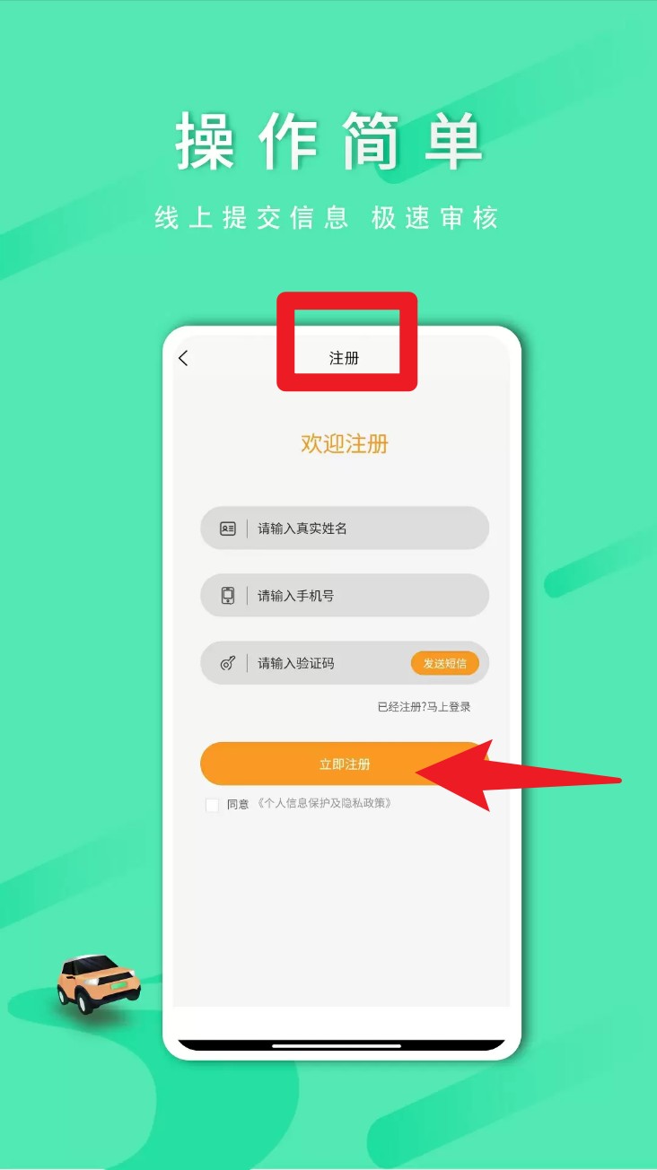 1. 进入注册页面,输入姓名、手机号和验证码,勾选协议后点击「立即注册」完成账号创建。