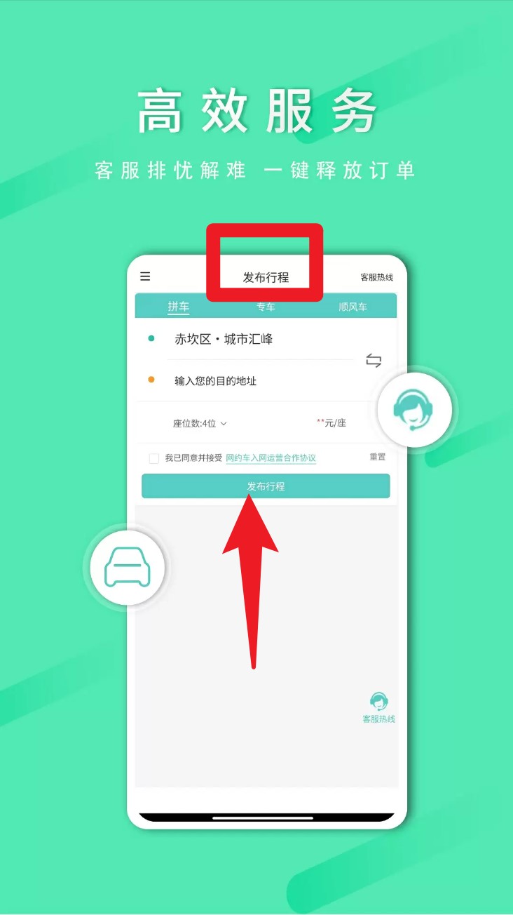 2. 注册成功后点击首页「发布行程」,填写起终点地址与座位数,即可一键发布行程。