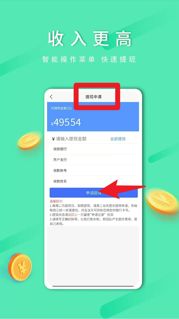 4. 完成订单后进入「提现申请」界面,输入金额及账户信息,点击按钮提交提现申请。