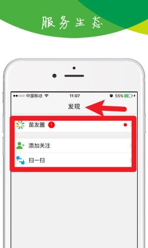 2、点击“发现”模块后,可以进入苗友圈查看动态,也能添加其他用户关注或使用扫一扫功能进行互动操作。