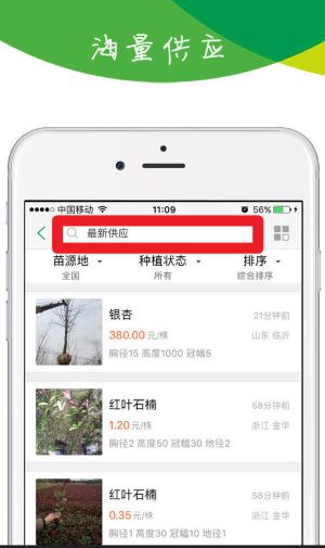 3、进入“最新供应”页面后,可浏览各类苗木的名称、价格、种植状态与供应时间,方便比价和下单采购。