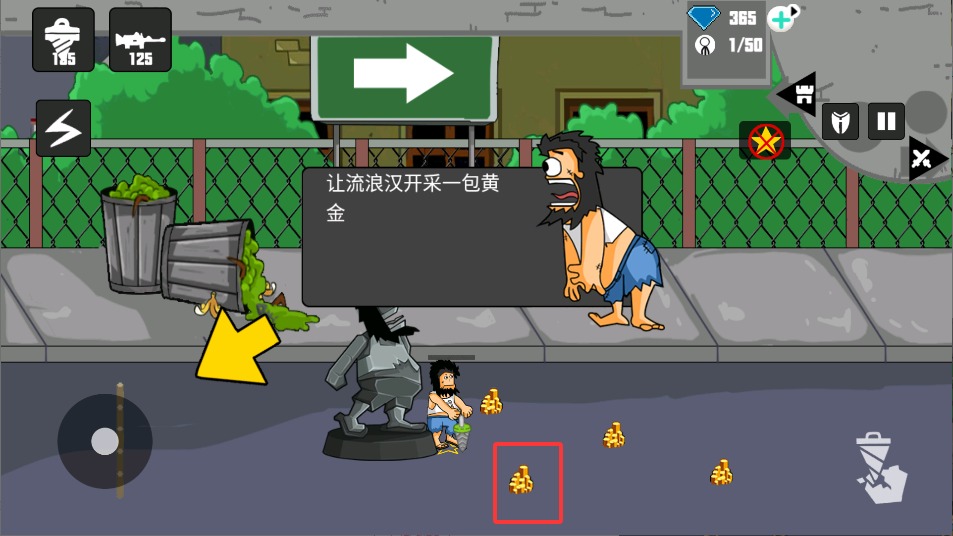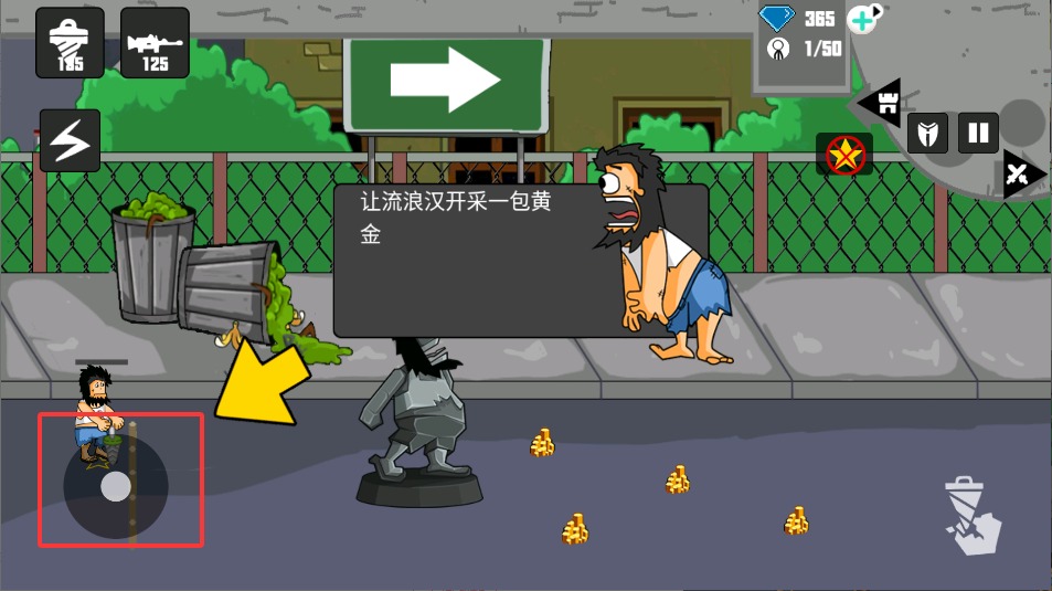 1、进入游戏后通过手指滑动屏幕控制流浪汉移动,在城市街道穿梭时要注意收集散落的金币和补给品。