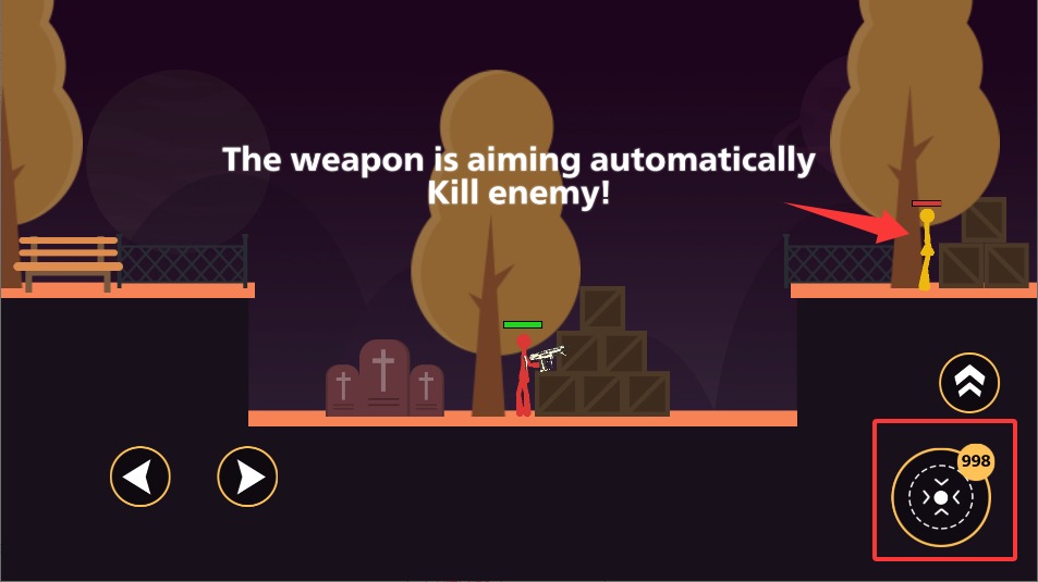 1、进入战斗界面后,点击屏幕左侧区域操控火柴人左右移动,灵活走位躲避敌方攻击,同时寻找有利射击位置。