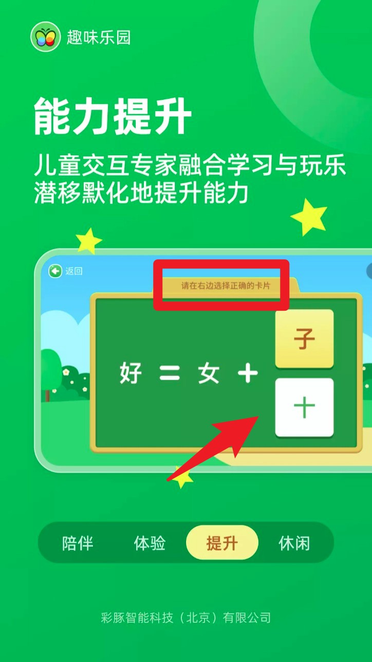 2. 进入能力提升板块,根据屏幕提示完成组字练习,例如点击右侧卡片选择正确部件组合,让孩子通过拆分结构理解汉字含义。