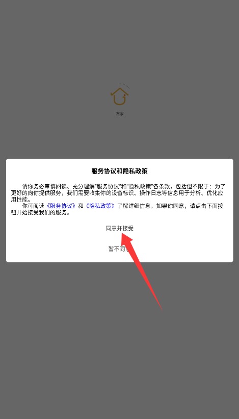 1、初次使用需完整阅读平台服务条款与隐私政策,确认后点击同意并接受进入应用。