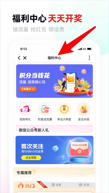 1.进入福利中心可参与每日抽奖、积分兑好礼、抢红包等活动,轻松赚取流量与话费福利。