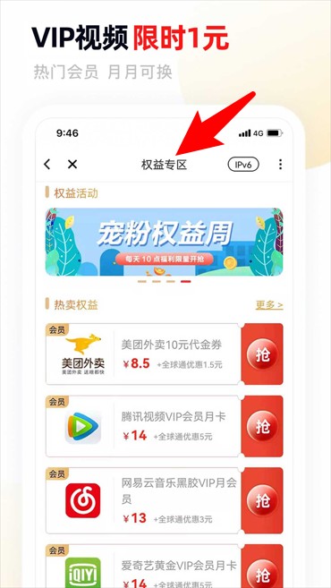 3.在权益专区可限时低价兑换VIP会员、外卖券等热门权益,享受专属优惠活动,天天有惊喜。