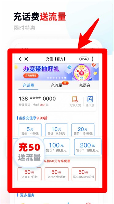 4.充值页面支持官方话费充值与送流量活动,多种面额可选,充值50元起享受多重赠送福利。