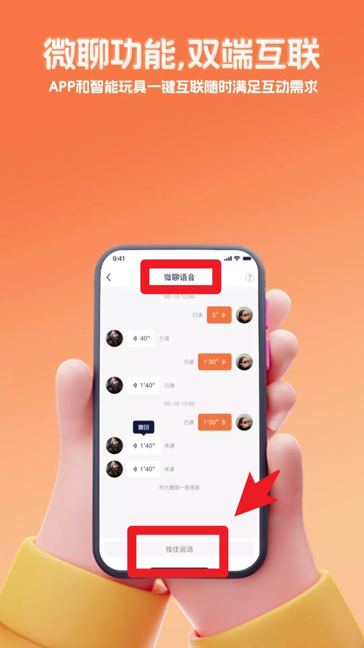 3. 切换至「微聊语音」页面,长按底部“按住说话”即可录制语音发送,与绑定设备或用户实时语音互动。