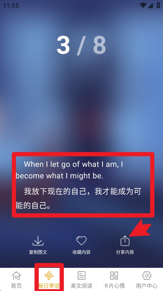 3. 点击下方「每日寄语」页签,进入语录卡片轮播模式,支持左右滑动查看、点击按钮即可复制或收藏句子。