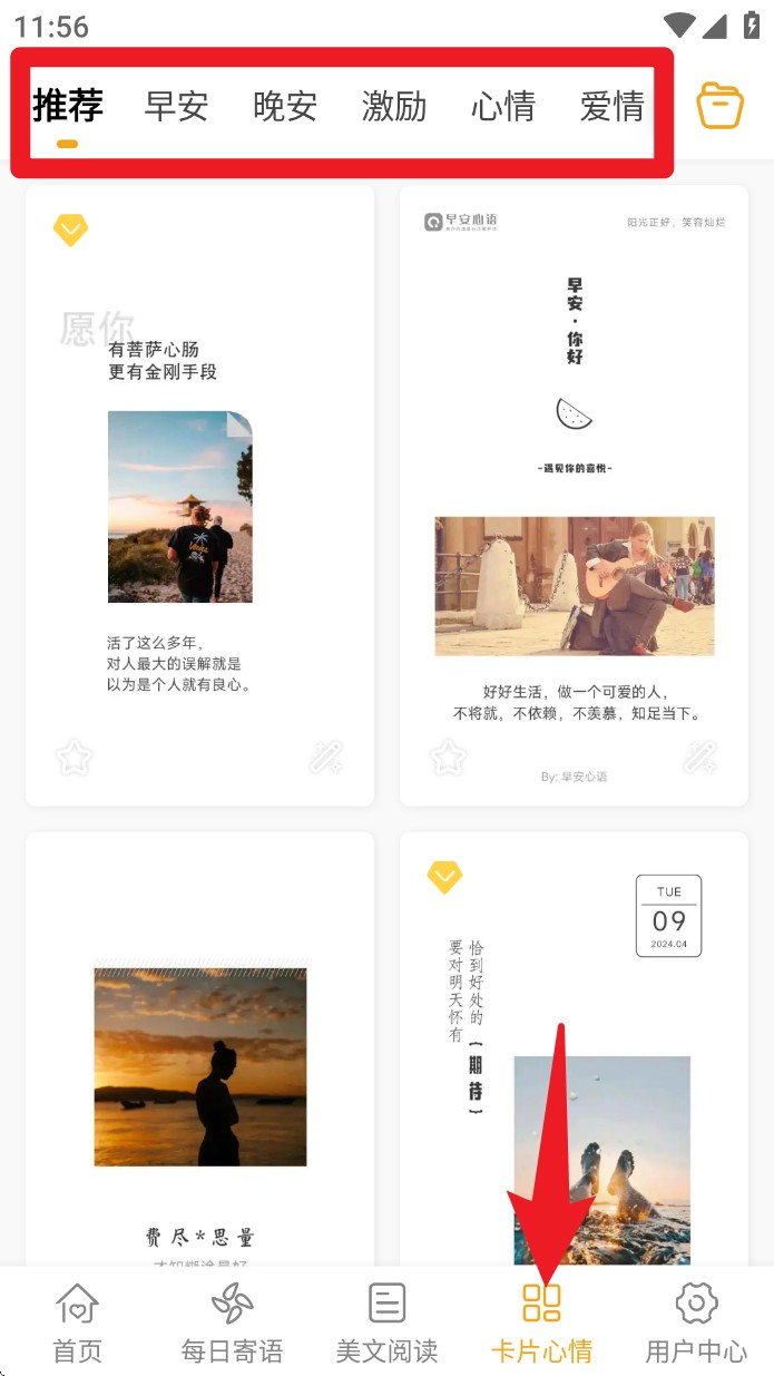5. 点击底栏「卡片心情」切换至图文心语区,可浏览分类推荐的情绪卡片,长按可下载或分享图卡内容。