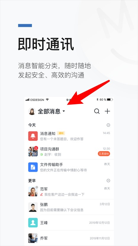 1、进入应用主界面后可查看“全部消息”,实现消息分类显示,支持快速搜索联系人或消息内容。