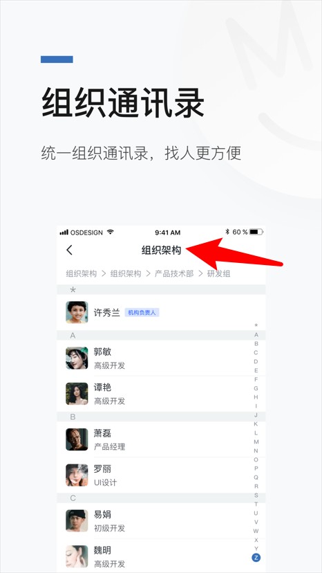 2、点击“组织通讯录”可浏览组织架构,按姓名或部门分组显示,查找同事更高效便捷。