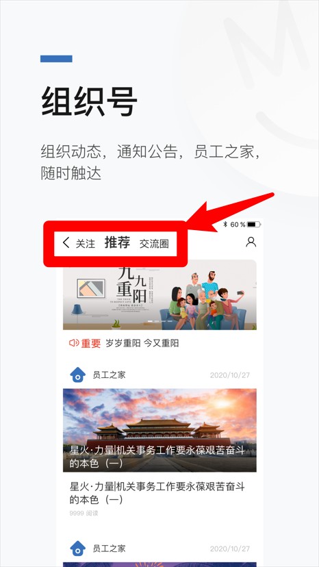 3、组织号页面展示公司动态和公告内容,通过“推荐”“关注”“交流圈”三栏获取丰富资讯。