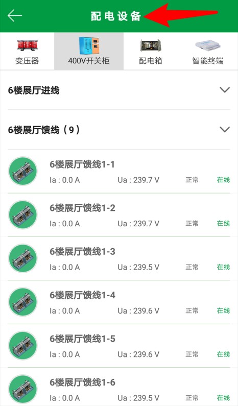 4、在“配电设备”页面中可查看各楼层设备状态、电压、电流等信息,支持设备分类展示。