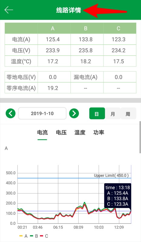 5、进入“线路详情”页面可查看详细的电流、电压、温度等数值,并有图表辅助分析。