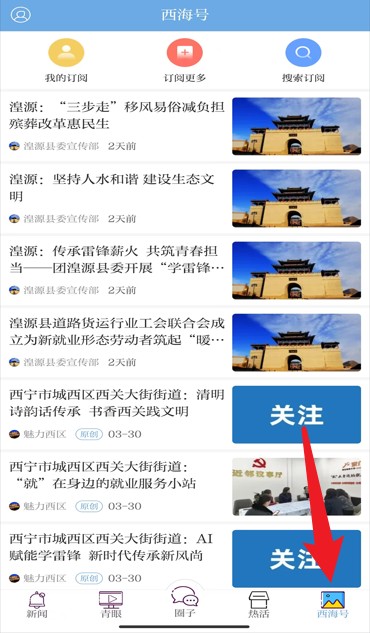 4、西海号栏目可查看本地政务资讯、自媒体内容并选择关注,方便获取相关机构发布的权威信息。