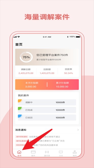 2、首页页面汇总用户调解数据、补贴金额及案件进度,清晰展示处理情况与累计收益明细。