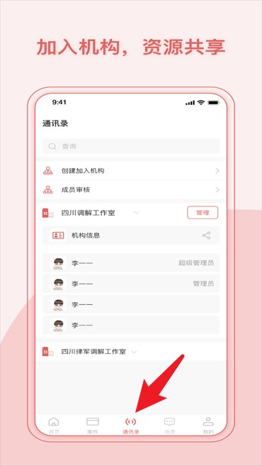 4、通讯录功能支持加入机构、查看成员、统一管理团队信息,实现资源共享与协同办公。