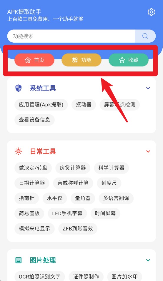 1、首页、功能、收藏三个按钮清晰呈现,方便用户快速跳转不同页面进行操作使用。