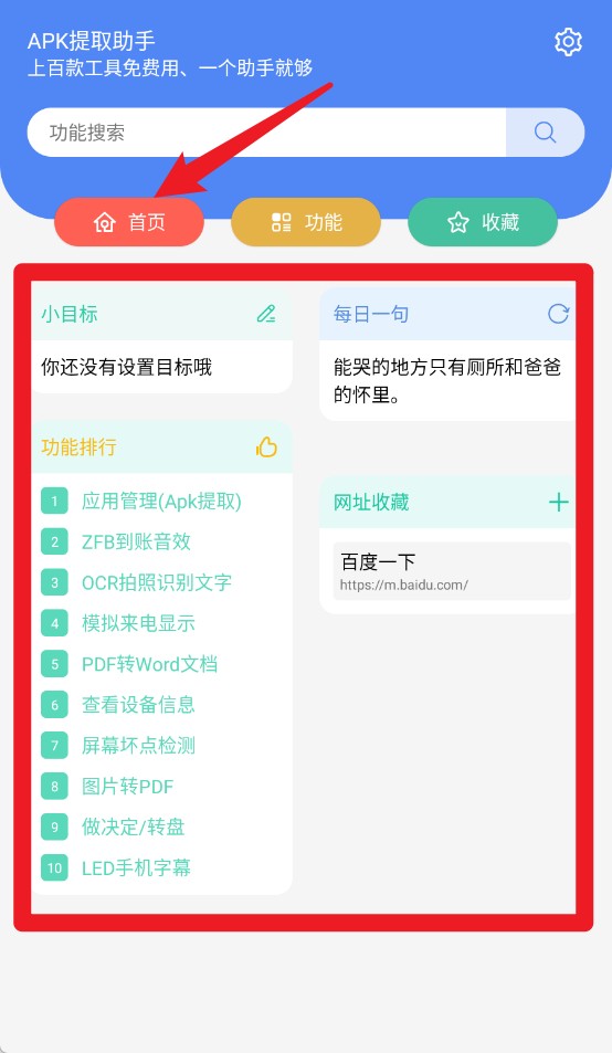 2、首页界面可查看功能排行榜与每日一句,并可设置目标与快速添加网页收藏。