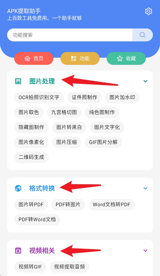 3、功能分类详细清楚,图片处理、格式转换与视频相关工具一应俱全,使用简单明了。