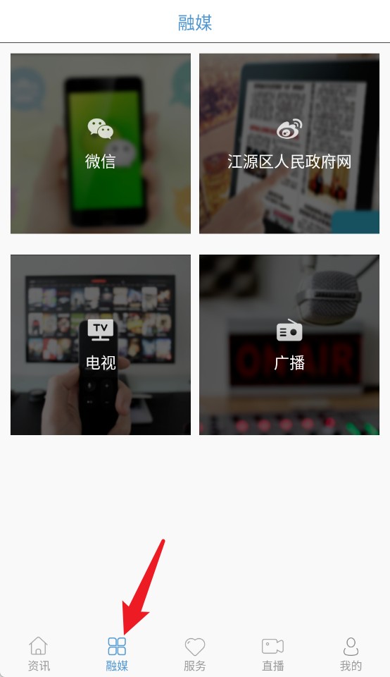 2、点击下方“融媒”入口,可访问微信公众号、政府网、电视广播等多种传播平台。