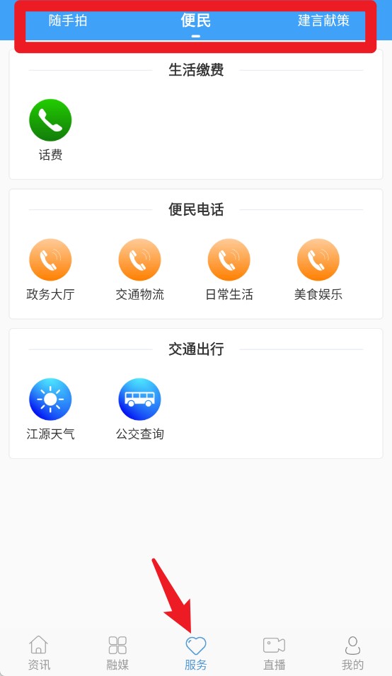 3、进入“服务”页面,在“便民”栏目中可快速查询话费、天气和公交等生活信息。