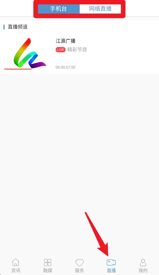 4、在“直播”模块中可切换手机台和网络直播,随时收看江源广播精彩节目。