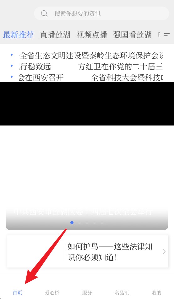 1、首页模块展示最新资讯推荐,涵盖新闻要闻与政策动态内容,点击下方“首页”按钮可随时返回主界面。